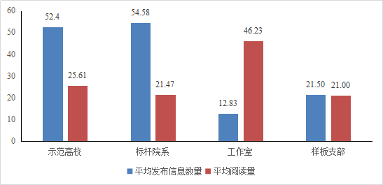 总的看,各创建单位发布的信息总量较为可观,但平均每条信息的阅读量较少,难以形成良好的示范效应。“双带头人”教师党支部书记工作室的信息发布数量虽然最少,但平均阅读量要明显高于其他三类创建单位。经调查,“双带头人”教师党支部书记工作室在信息发布后积极进行宣传推广,一些负责人主动将链接转发至“双带头人”工作室微信联络群,有效提升了信息阅读量。