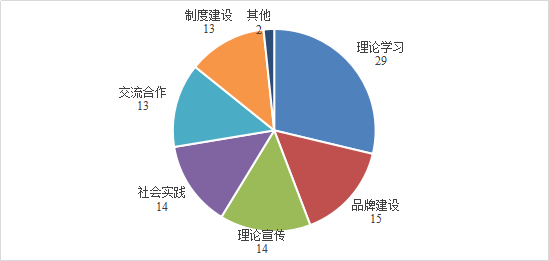 2.从信息报送内容看,各创建单位在暑期依然能够紧抓党建工作不放松,坚持以党建工作为引领,发挥党组织和党员骨干的带头作用,从理论学习、品牌建设、理论宣传、社会实践、交流合作等方面开展丰富多彩的党建活动(见图3)。