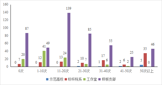 1.从信息数量看,2019年1月起,各创建单位积极在思政网平台上发布工作进展、经验成效等信息。大多数创建单位能够按照要求及时对工作情况进行发布。截至2019年8月31日,共有752家创建单位在思政网上进行了信息发布(见图1),发布信息次数超过10次的单位共有480家,其中示范高校10家,标杆院系81个,“双带头人”教师党支部书记工作室39个,样板支部350个。部分创建单位未按要求及时发布信息,有114家创建单位信息发布的次数为0,其中标杆院系7个、“双带头人”教师党支部书记工作室20个、样板支部87个。