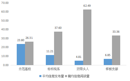 多数创建单位重视宣传在思政网上发布的信息,增强自身建设的影响力和辐射力,保证创建工作有效落实。1、2月期间,各创建单位在思政网发布信息总阅读量将近10万次,平均每条信息阅读量约为35.41 次,宣传工作取得了一定成效。有56家单位所发布信息的篇均阅读量在100次以上,其中标杆院系18家,“双带头人”教师党支部书记工作室9家,样板支部29家。部分创建单位积极加强宣传引导,营造创建氛围,如武汉大学马克思主义学院党委和郑州大学法学院教工第四党支部书记工作室,在1、2月期间分别仅发布1条信息,却都达到了高于1000次的篇均阅读量,起到了典型示范作用。但也有部分单位仅关注信息发布的数量,但未获得理想的篇均阅读量,宣传的实质效果未能及时体现。
