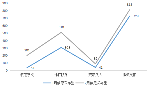 从信息报送数量看,各创建单位在疫情防控期间,仍积极进行月度信息报送。1—2月期间,共有214家单位报送了常规信息,其中示范高校9家,标杆院系88个,“双带头人”教师党支部书记工作室85个。另外,有32个样板支部主动对“双创”建设情况进行报送。