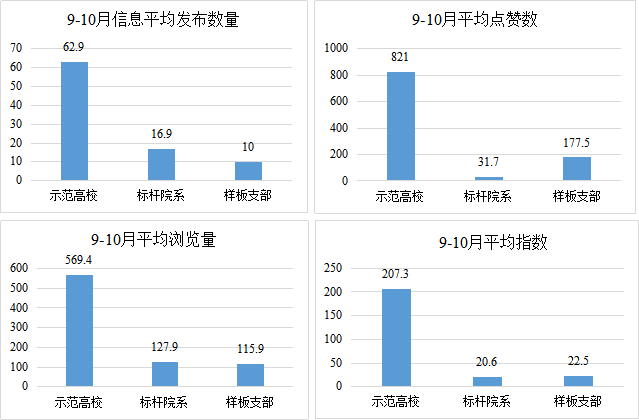 整体来看,各类型创建单位在9—10月发布信息积极性较7—8月有所提高。示范高校的信息发布数量与质量相对较高;标杆院系在信息发布数量、平均浏览量和平均指数上均略高于样板支部,在平均点赞数上则明显低于样板支部。