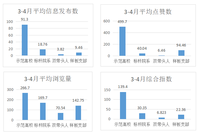 从各创建单位在育人号上的指数来看,3—4月期间,在已经发布过信息的创建单位中,示范高校的平均综合指数为139.4,标杆院系的平均综合指数为30.05,“双带头人”的平均综合指数为6.93,样板支部的平均综合指数为28.24。